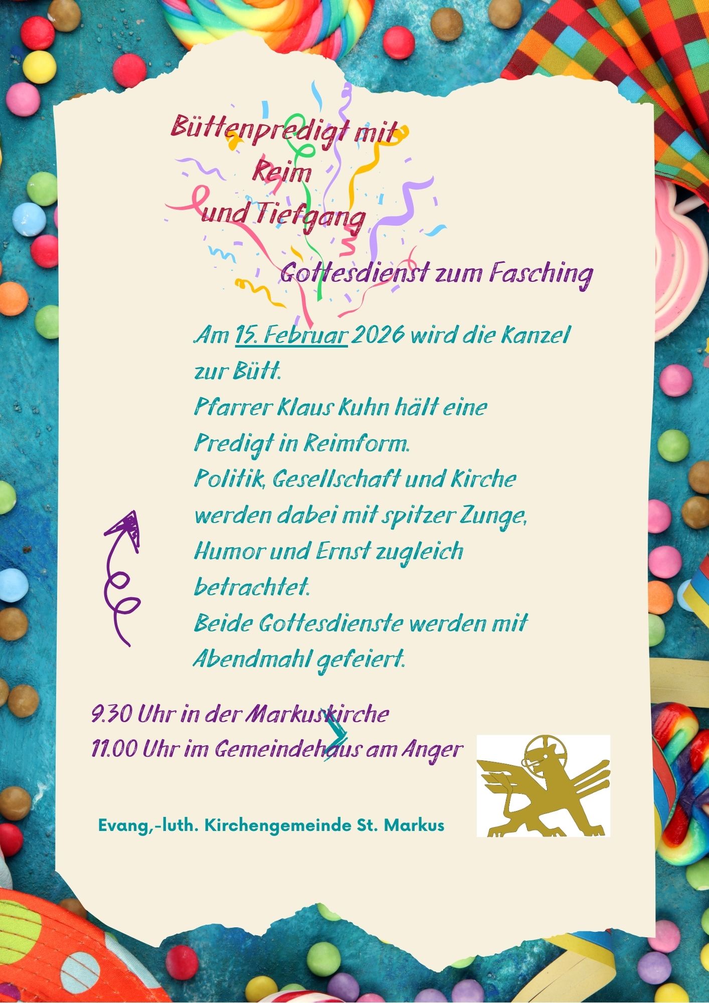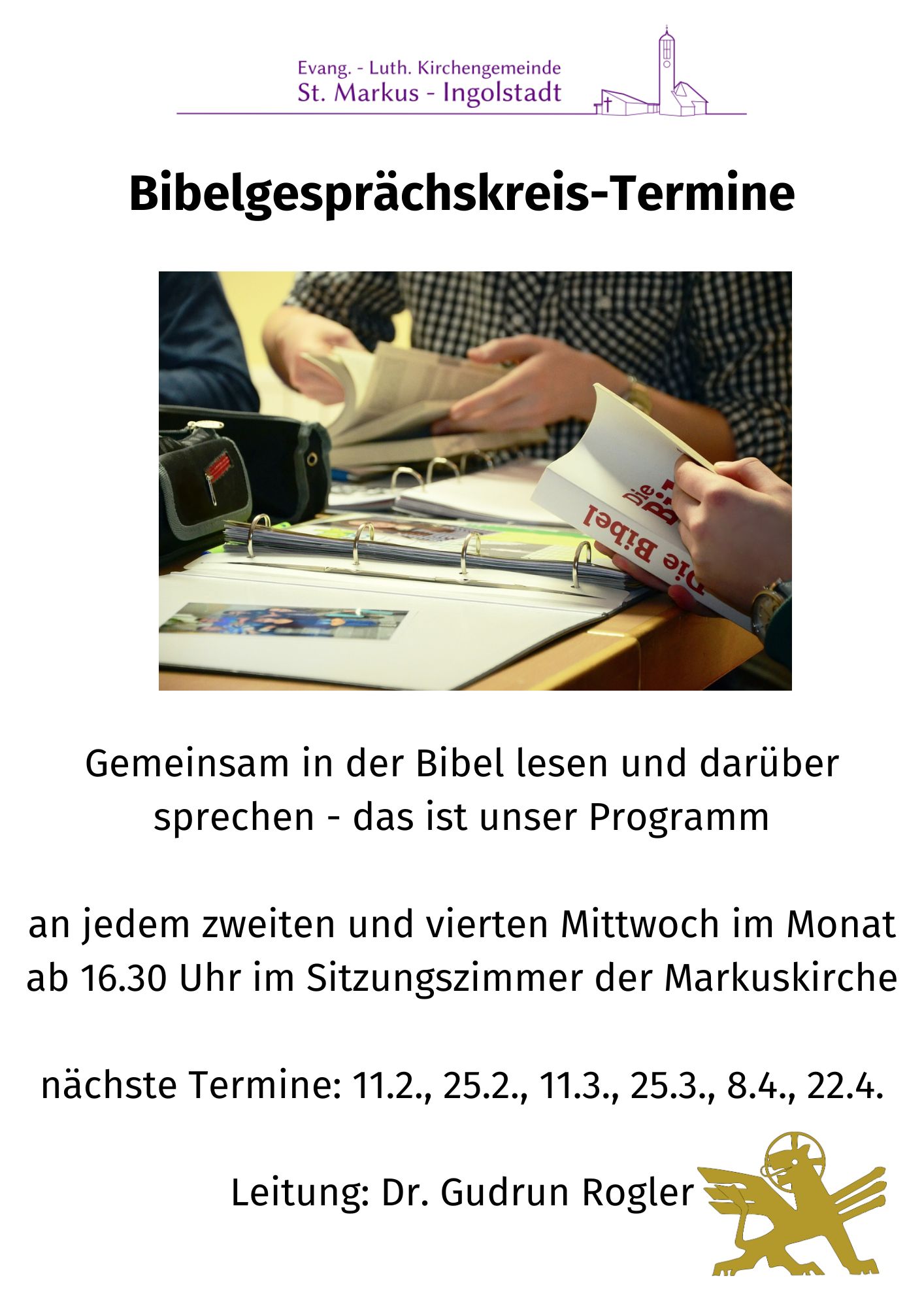 Das Büchereiteam St. Markus lädt herzlich ein zu einem Literaturgottesdienst, am Sonntag, 01.März 2026, um 11.00 Uhr im Gemeindehaus, Am Anger 44.