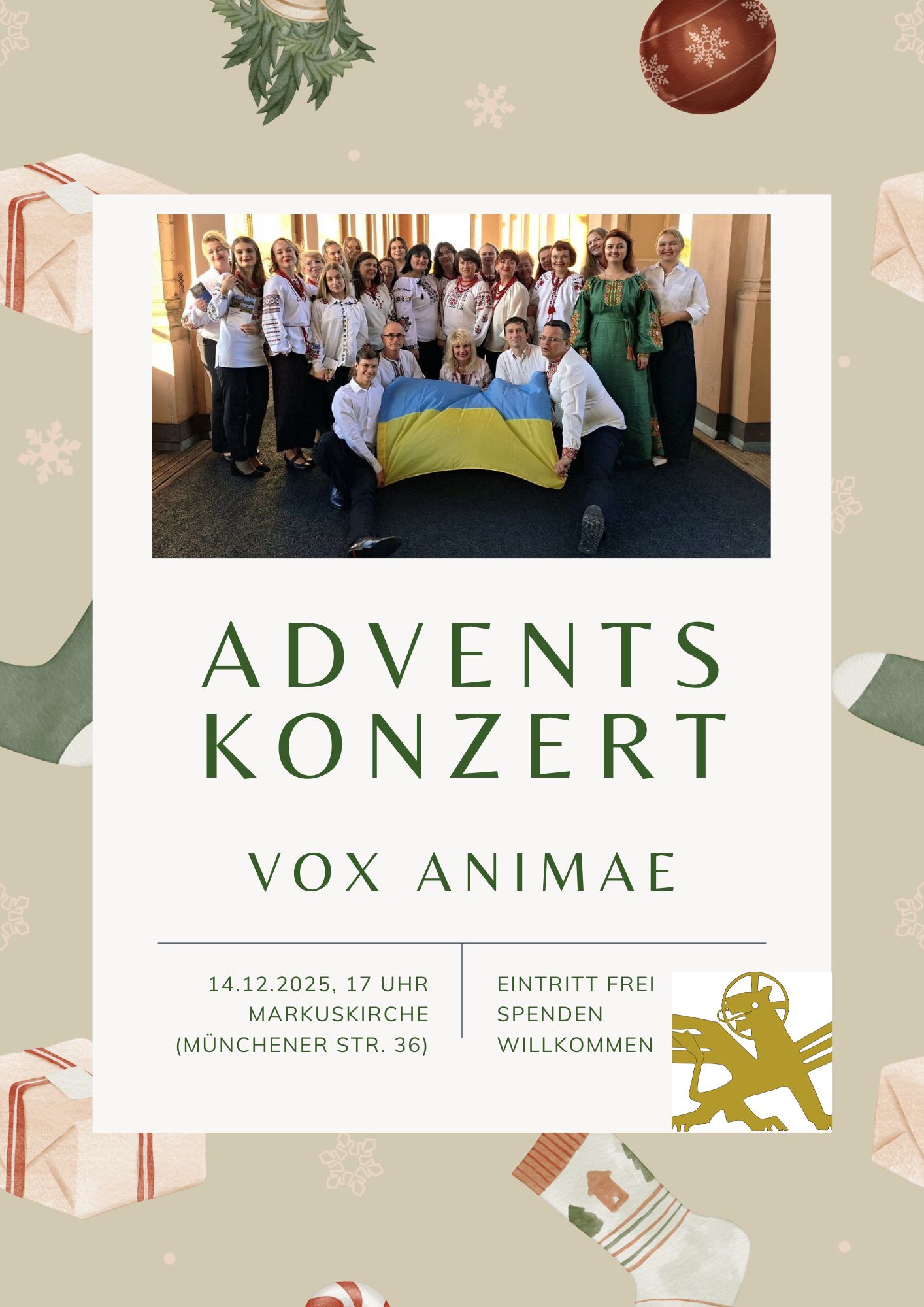 Der ukrainische Amateurchor lädt am dritten Adventssonntag zu einem festlichen Konzert in die Markuskirche ein. Das Publikum erwartet ein vielseitiges Programm mit traditionellen ukrainischen Weihnachtsliedern (Koljadky) sowie bekannten internationalen Werken, die die besondere Atmosphäre der Adventszeit widerspiegeln. Der Chor möchte mit seinen Gästen die Vorfreude auf das Weihnachtswunder teilen und einen Abend voller Wärme, Besinnlichkeit und Inspiration schenken.