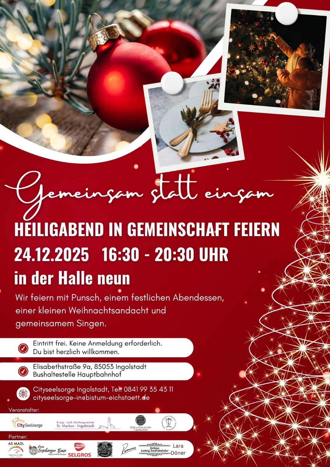Letztes Jahr war Premiere: Erstmalig fand in der "Halle neun" am Hauptbahnhof „Heiligabend in Gemeinschaft feiern“ statt. Die Resonanz war enorm. Wir mussten sogar noch anbauen, damit alle einen Sitzplatz bekamen. Sehr bunt hat sich die Festgemeinde zusammengesetzt. Aus vielen Einzelnen wurde so eine Gemeinschaft: eine Heiligabendgemeinschaft, die zusammen isst und trinkt, sich fröhlich unterhält, singt und die Weihnachtsbotschaft hört. Genau darum geht es bei diesem ökumenischen Projekt, an dem wir als Kirchengemeinde Mitveranstalter sind, auch heuer wieder. Wir wollen zum zweiten Mal in der Halle neun gemeinsam Heiligabend feiern – und laden herzlich dazu ein, auch zur Mitarbeit. Zusätzliche Hände können wir immer gut gebrauchen. Aus Erfahrung können sich dabei alle sicher sein: Es ist eine sehr dankbare Aufgabe und man wird selbst reich beschenkt. Melden Sie sich also gerne bei Pfr. Kühn (jonathan.kuehn@elkb.de)!