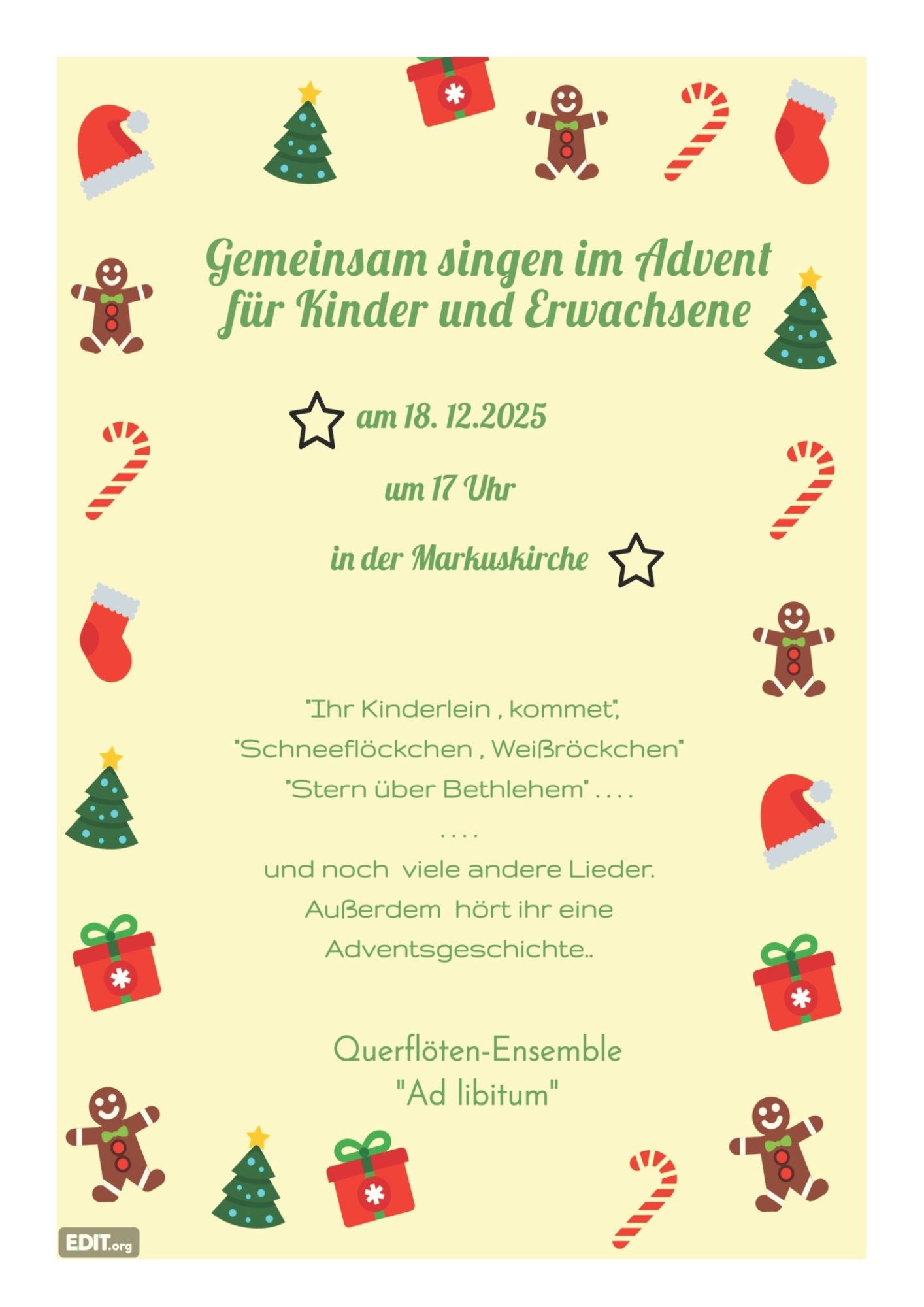 Kommt am 18.12.25 um 17 Uhr zu uns in die Markuskirche zum Adventssingen!